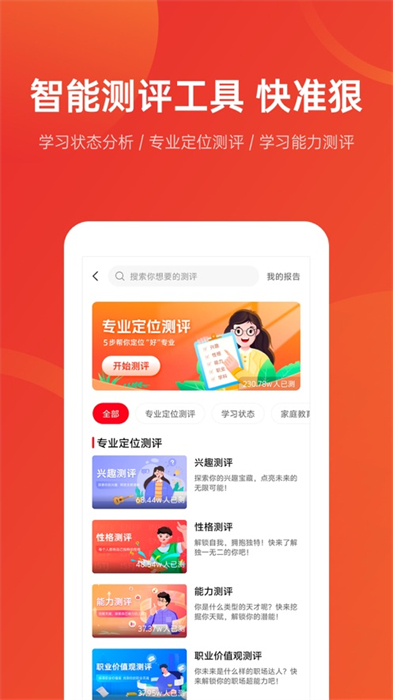 针对专业选择迷茫的考生,优志愿整合了国际权威的霍兰德职业兴趣测评系统,通过科学的测试帮助考生发现自身兴趣特长,并将测试结果与专业数据库智能匹配,为考生推荐最适合的专业方向。同时结合个性化定制功能,提供一对一的专业选择建议。
