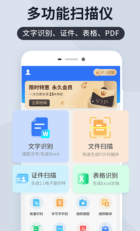 扫描君是一款专为Android平台打造的多功能OCR拍照识别软件,凭借其强大的文字识别能力和丰富的实用功能,成为用户处理纸质文档和图片文字的得力助手。这款软件集成了OCR文字识别、手写识别、拍照翻译、文件扫描、证件扫描、表格识别等多项实用功能,能够轻松将图片、纸质文档中的文字转换为可编辑的电子文本,并支持导出为Word、PDF、TXT等多种格式,满足用户在不同场景下的使用需求。