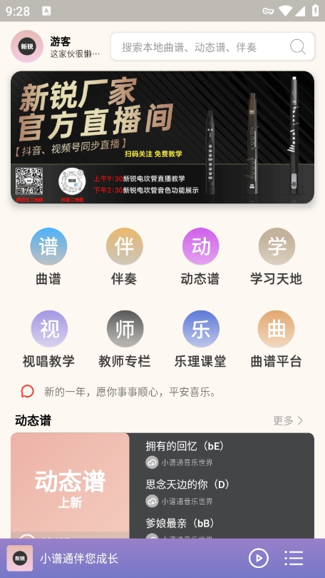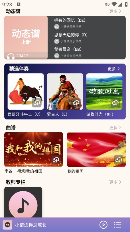 在本站下载安装小谱通app并打开,在首页是可以获取到丰富功能的,包括曲谱搜索、教学视频、乐器调音等核心模块。曲谱即可免费下载你想要学习演奏的曲谱,支持离线保存方便随时练习。同样,如果您要下载也是一样的操作,只需在曲谱详情页点击下载按钮即可。点击下方的播放按钮即可播放了,软件会自动加载动态谱面,并支持调整播放速度、循环练习等功能,让学习更加灵活高效。