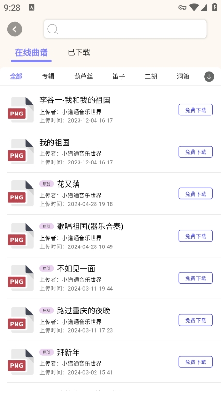在首页点击曲谱进入,可以查看所有已下载和未下载的曲谱资源。然后在曲谱界面里选中已下载进入,系统会按照乐器类型自动分类存储。最后就可以看到下载的文件了,用户还可以创建个人收藏夹,将常用曲谱进行分类管理。下载的曲谱支持多种查看模式,包括标准五线谱、简谱以及动态演示谱,满足不同用户的使用习惯。