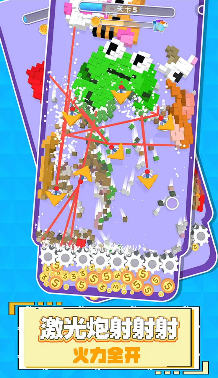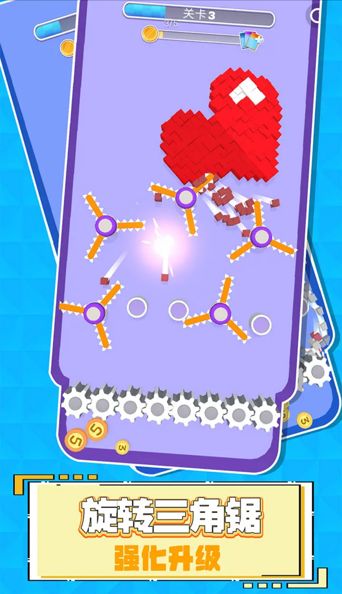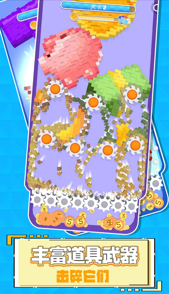 世界拆迁队正式出动!锋利的小齿轮,粉碎一切所有Q萌的像素小方块,没有任何一块小方块能逃出你的手掌心!游戏轻松有趣,操作简单流畅,通过破坏各种物品来获得爽快体验。独特的物理引擎让每次破坏都充满惊喜,逼真的音效更添沉浸感。无论是精致的玻璃制品还是坚固的砖墙,都能成为你释放压力的对象,真是居家一定要备上的减压神器!