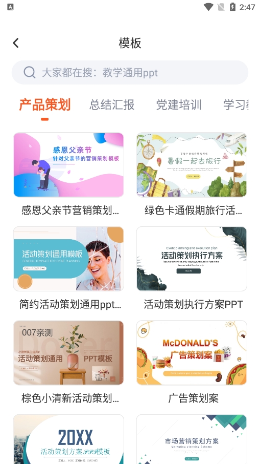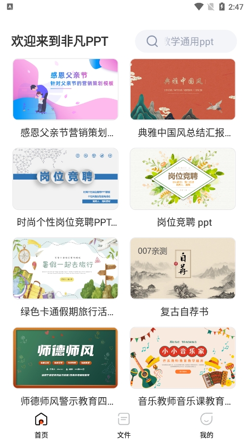 无论您从事哪一个、从事何种类的工作,都可以在app内寻找相应的PPT模板,支持关键词智能搜索和风格筛选;