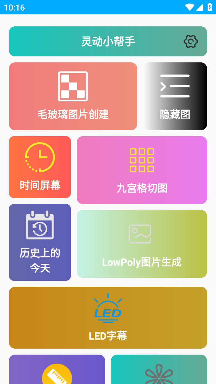 灵动小帮手是一款多功能的助手,拥有多种功能服务,它旨在为用户提供便捷、高效的生活助手服务,包含了图片创建、隐藏图、时间屏幕、九宫格切图、尺子、图片制作等,多样化的功能服务,根据个人的使用需求在线操作使用,都是免费提供的,无需会员,在线一键操作使用,实用性很强,覆盖了生活中的方方面面,十分的强大化,它还能够根据用户的使用习惯和喜好,提供个性化界面设置,让用户拥有更优质的体验。同时软件还会根据用户反馈不断优化功能,确保每个工具都能完美适配不同型号的手机设备。