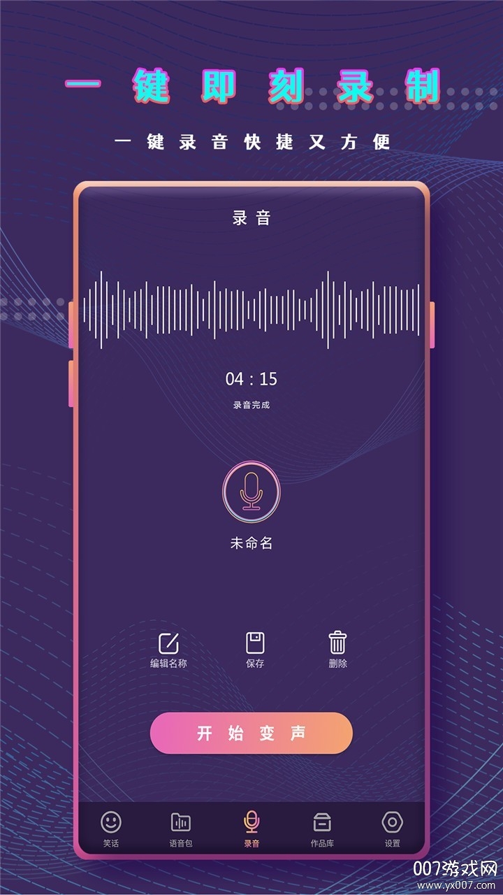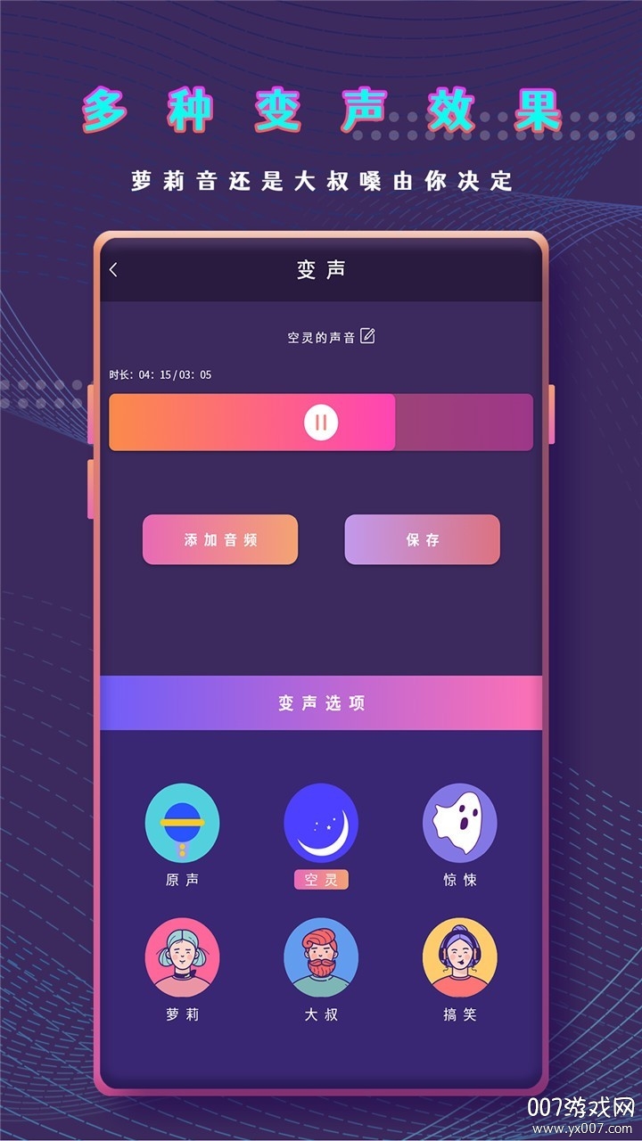 【录音变声搞笑集合】录制完成后,您可以从数十种变声效果中自由选择,包括空灵、萝莉、大叔、机器人等趣味音效。每个效果都经过专业调校,保证变声效果自然有趣。处理后的音频可保存至本地,随时调用分享给好友。