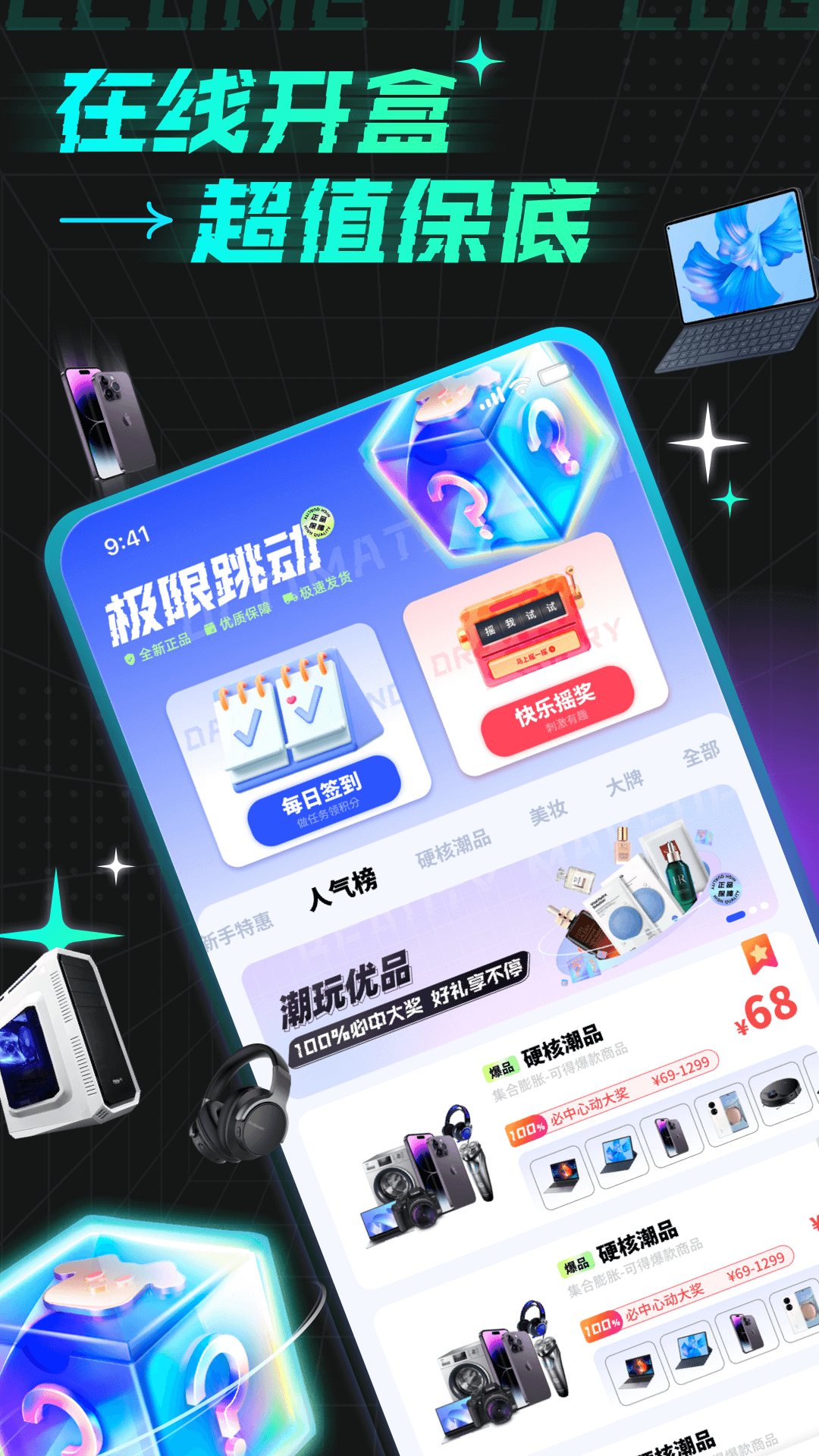 商品分类清晰,采用智能推荐算法,根据用户浏览习惯自动调整展示顺序,提升购物效率;每日盲盒推荐,由专业买手团队精心挑选,结合时下流行趋势和用户偏好,提供个性化推荐;订单记录,支持多维度筛选和搜索功能,让用户随时掌握订单状态和物流信息;商品兑换功能,用户可以通过积分兑换心仪商品,增加平台互动性和用户粘性;丰富的优惠活动,包括新用户专享、限时特惠、会员专享等多重福利;快速发货,与多家优质物流公司合作,确保商品安全快速送达;商品分享功能,支持一键分享到主流社交平台,让用户轻松晒出开箱惊喜。