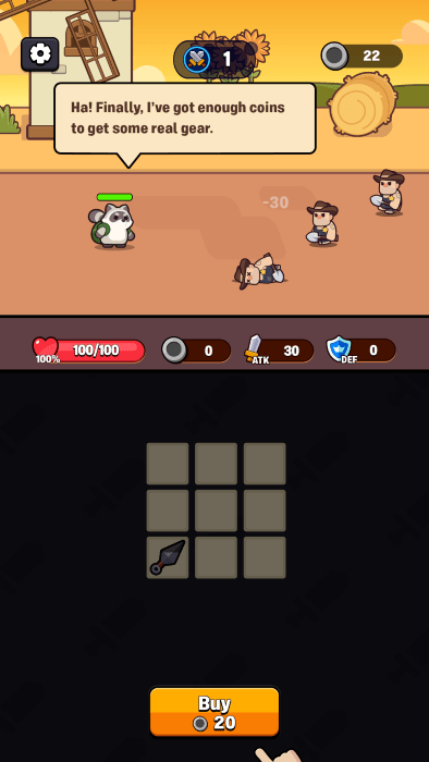 游戏开始后,点击绿色【Start】按钮即可进入第一章,玩家将操控可爱的小浣熊开启牧场冒险之旅。在战斗过程中,建议优先花费20银币购买装备,这些装备可以显著提升攻击力,帮助玩家快速击败牛仔敌人。玩家可以通过拖动道具栏中的【炸药】或【包袱】到上方装备栏,充实自己的武器装备,为后续更激烈的战斗做好准备。点击【炸弹】图案可以查看装备的详细属性,了解每件装备的特点,从而在战斗中做出更合理的战术选择。