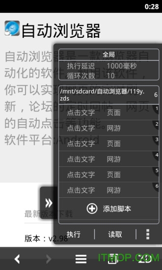 自动浏览器apk是一款革命性的浏览器自动化工具,它能帮助用户实现各种复杂的浏览器操作自动化。通过这款软件,您可以轻松完成网页操作序列的自动化处理,包括但不限于:智能点击各类链接和文字、定时自动刷新网页、论坛自动发帖回帖、网页功能自动化测试等。特别值得一提的是,它还能在手机wap页面游戏中实现智能挂机功能,支持wap炸弹发送和定时消息推送等特色功能。简而言之,任何通过浏览器可以完成的操作,自动浏览器都能帮您实现自动化处理,大幅提升工作效率。