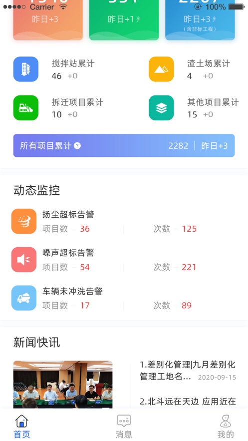中有多种功能,用户可以在这里清晰看到所有项目的概览信息,包括环境指标、人员出勤等关键数据。