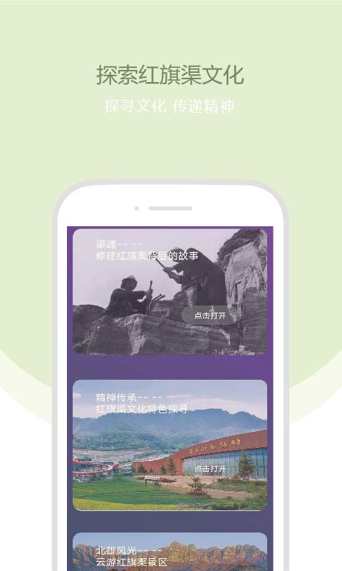 精神传承--红旗渠文化特色探寻。走进太行山,看"红色工程",走进红旗渠纪念馆、青年洞,与修渠劳模;走进扁担精神纪念馆,体会一心为民、开拓创新的服务精神:走进县委书记的好榜样—谷文昌故居,书记的高风亮节。丰富的学习内容、深刻的意义,给人以灵魂的强烈震撼。