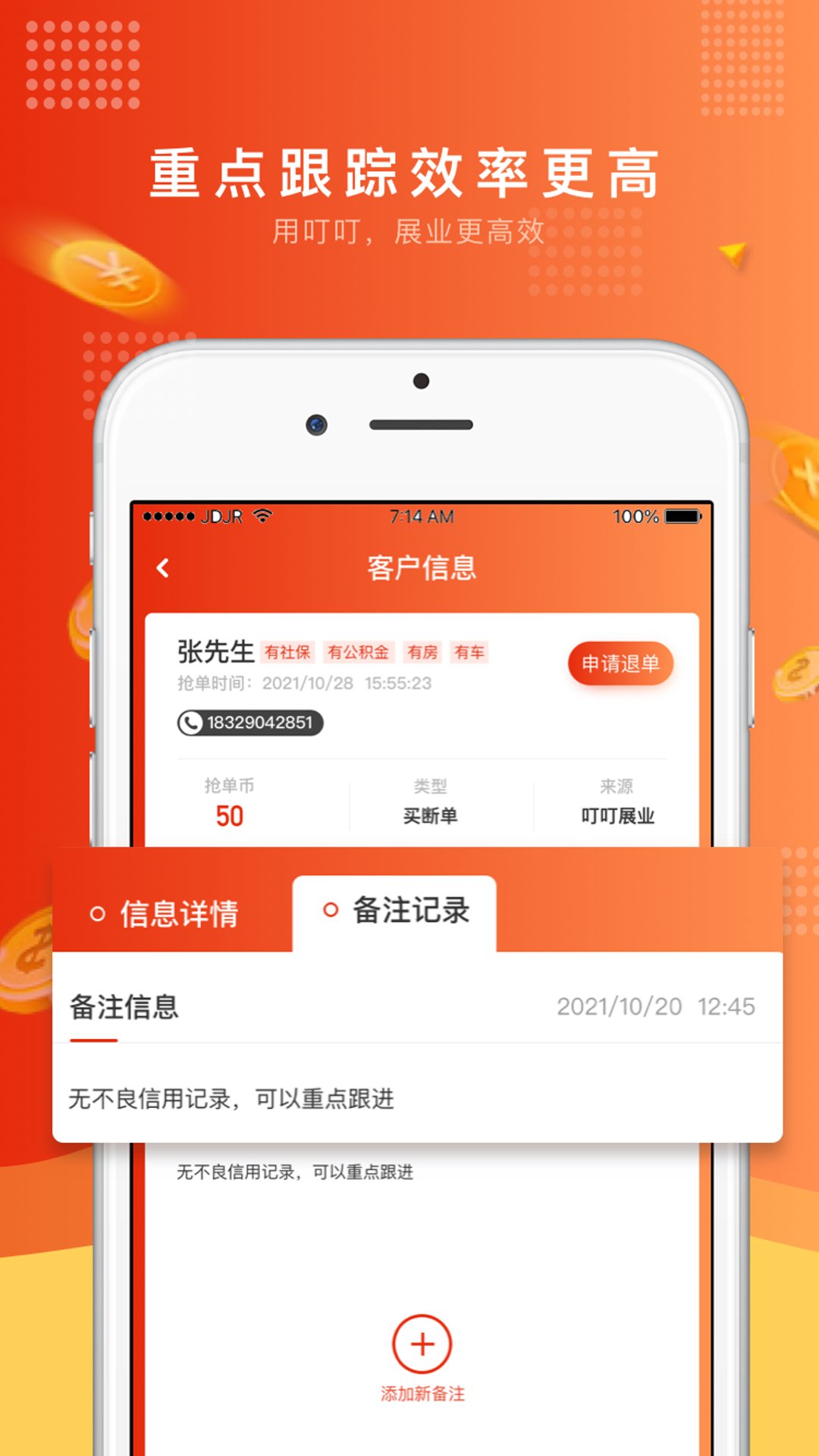 叮叮展业App是信贷行业领先的数字化展业平台,集获客工具、客户管理、业务培训于一体。平台汇聚了数十万信贷从业者的实战经验,提供覆盖全业务流程的解决方案。通过大数据分析和AI技术,为不同阶段的从业者提供个性化成长方案,帮助用户实现从获客到成交的全流程能力提升,是信贷从业者不可或缺的展业助手。