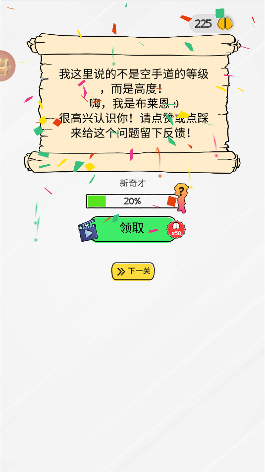 游戏最大的特色是鼓励玩家进行头脑风暴,通过正确解答获得奖励并进入下一关,这种轻松欢乐的玩法能有效锻炼思维能力。丰富多样的关卡道具为解谜提供不同帮助,有些道具能提示关键线索,有些则能直接解决部分难题。超过100个精心设计的关卡涵盖了天文地理、脑筋急转弯等多种类型,每个难题都需要玩家充分发挥想象力。当遇到卡关时,往往需要转换思考角度,用全新的视角来审视问题,这种突破常规的思维方式正是游戏的魅力所在。