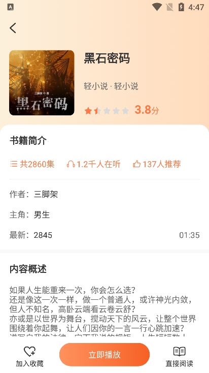 打开软件主界面可以看到多种小说资源,精心设计的UI界面让各类书籍一目了然。通过分类或者搜索的形式找到喜欢的小说,系统会根据历史记录智能推荐相似作品。点击心仪的小说就可以开始听书了,支持后台播放和锁屏控制。在播放界面还能够对多种参数进行调节,包括播放速度、音效模式等。将喜欢的小说加入到书架中,下次打开时可以直接从上次中断的地方继续收听。