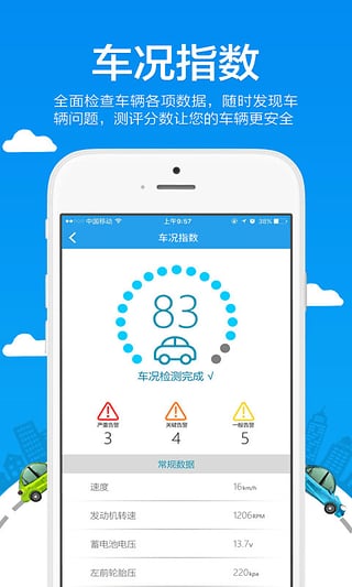 一键车检:全面检查车辆各项数据,随时发现车辆问题,测评分数让您的车辆更安全;升级诊断算法,可检测超过200项车辆参数。