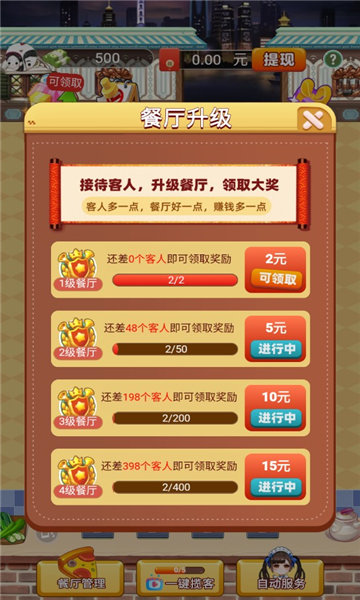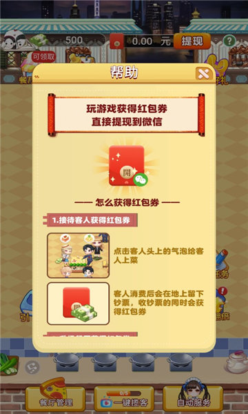 餐厅的经营策略直接影响收益,如何吸引更多顾客、提高服务质量都是需要认真考虑的问题。合理雇佣员工能帮助你处理日常事务,保证餐厅正常运营,这是成功经营的关键。明确分工,根据员工特长安排合适岗位,才能让餐厅高效运转。游戏支持红包提现功能,达到最低提现额度后,通过实名认证即可申请提现到微信或支付宝。