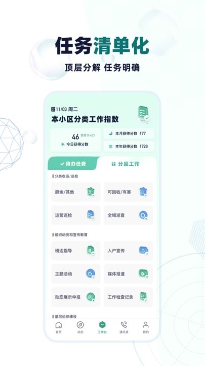 分类管理CRP提供了丰富实用的功能模块:垃圾分类指南模块收录了详尽的分类标准和使用说明,通过图文并茂的方式帮助用户准确识别各类垃圾;智能任务清单功能可以将垃圾分类工作分解为可执行的具体任务,让用户对工作内容和进度一目了然;数据可视化功能会将用户的分类成果转化为直观的图表和统计数据,帮助用户清晰了解自己的分类成效和改进空间。系统还支持多终端数据同步,确保用户随时随地都能查看和管理垃圾分类工作。