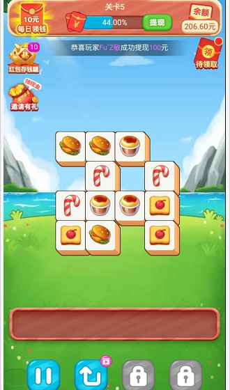 别再浪费你的空闲时间了。过来看看。三毛钱就能把你的手机兑换成现金了!游戏采用创新的红包奖励机制,让您随时随地都能享受游戏乐趣。每天登录还有额外奖励,轻松赚取零花钱。简单有趣的消除玩法搭配丰厚的现金奖励,绝对让您爱不释手。