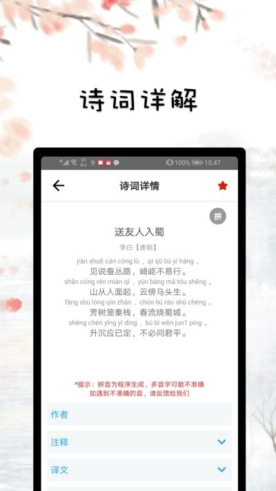 无论您是学生、教师还是普通文学爱好者,古诗词文赏析app手机版都能为您提供专业、便捷的诗词学习体验。软件操作简单直观,适合各个年龄段的用户使用。通过长期使用,用户不仅可以积累大量诗词知识,还能提高文学鉴赏能力,培养高雅的生活情趣。这款软件是传承中华优秀传统文化、提升个人文化素养的理想选择,让古典诗词之美触手可及。