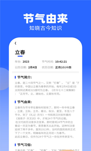 节气查询:用户可以通过节气查询功能获取详细的节气信息,包括节气起源、习俗、气候特点等,帮助用户全面了解中国传统节气文化。