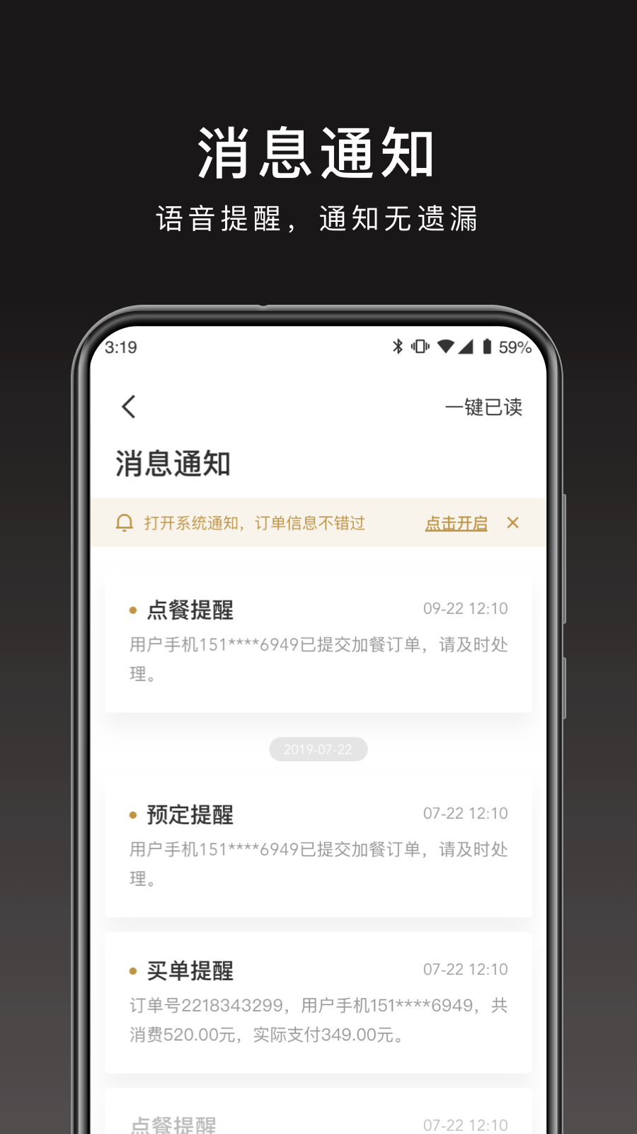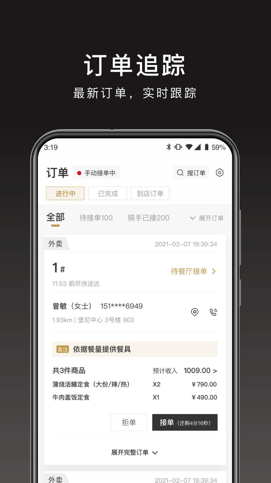 随时随地接单,处理催单,操作退单。系统会自动推送订单提醒,商家可以第一时间响应顾客需求,提升服务质量。