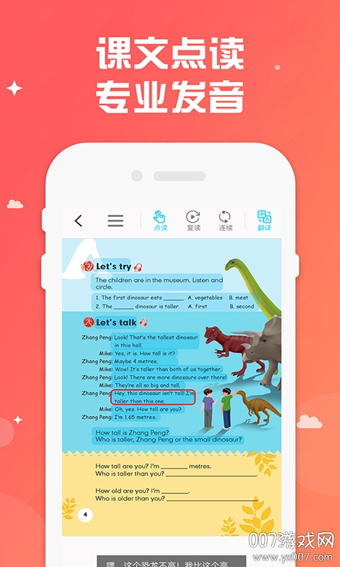 轻松提升自己的学习能力,众多点读教材按年级分类,用户可以选择要学习的课程进行系统学习。专为小学生用户打造的手机英语学习工具,界面简洁友好,操作简单直观,方便用户随时随地进行学习英语。英语教学资源丰富多样,包含动画视频、互动游戏等形式,学生们也可以根据自己的需求来选择和学习英语知识。这里所有的英语课程都是同步教材的,内容经过教育专家严格审核,因此用户们可以放心在此学习。