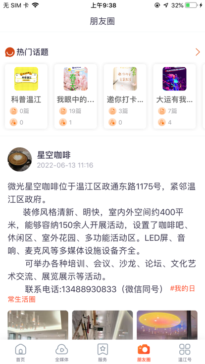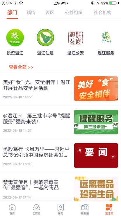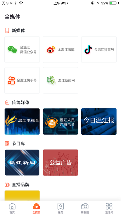 "全媒体"集成了温江区融媒体中心的微信公众号、微博、抖音账号及温江电视台、《今日温江》报等全媒体矩阵,24小时不间断提供最新鲜的新闻资讯,打造全方位的资讯获取渠道。