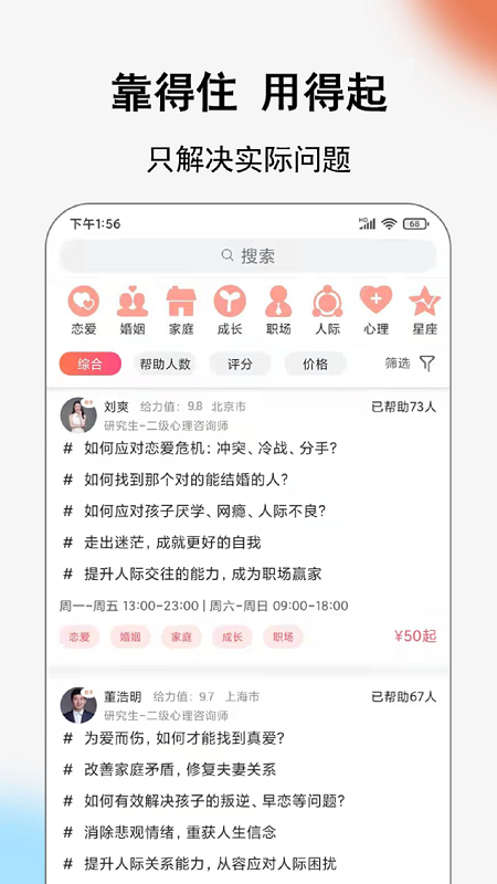免费咨询让你不用担心费用问题,软件内是有很多免费咨询的服务的,包括情感急救、分手疗愈等12个专题板块,让你可以很轻松就获得服务。轻松运用很便捷,简洁的UI设计让中老年用户也能快速上手,而且就算你不在内咨询相应人员,也是可以在内找到具体和其相关的问答来了解,平台收录了10万+真实情感案例供你参考。你还可以在里面找到和自己婚姻有关的内容,专业婚姻家庭咨询师会提供法律、心理等多维度建议,在你以为一段婚姻很迷茫时是可以通过软件来解惑,每周还有情感大咖直播答疑。