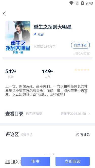 打开软件后,底部导航栏会展示丰富的小说资源分类,包括热门推荐、新书上架、经典必读等专区。用户可以根据个人喜好浏览不同类别,或者直接通过搜索框查找特定作品。找到感兴趣的小说后,点击封面即可进入详情页面查看简介和目录。在阅读界面,用户可以选择"立即阅读"开启文字阅读模式,也可以点击"听书"按钮切换为语音播报模式。为了方便下次阅读,还可以将喜欢的小说添加到个人书架,系统会自动记录阅读进度,下次打开时可直接续读。