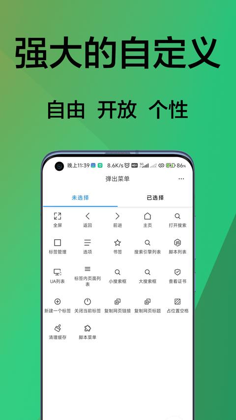 优化多标签管理状态栏的沉浸式体验。重新设计弹出菜单布局,提升操作便捷性。