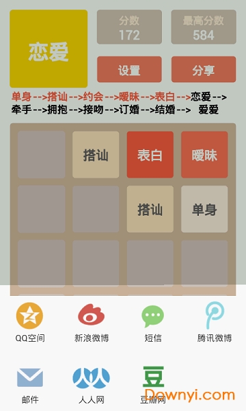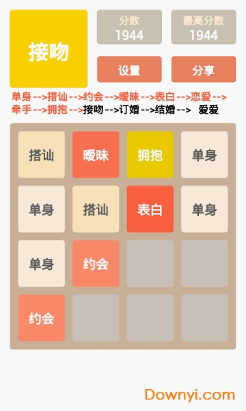 游戏开始后,在4x4的棋盘上会出现两个初始方块,玩家通过上下左右滑动屏幕来移动这些方块。每次移动后,系统都会在空白处随机生成一个新的方块。当两个相同状态的方块相撞时,它们会合并升级为下一阶段的方块。游戏的目标是通过不断合并,最终获得"结婚"方块。与经典2048不同的是,本作每个方块都代表着恋爱关系的发展阶段,让玩家在游戏过程中感受到恋爱的甜蜜与期待。