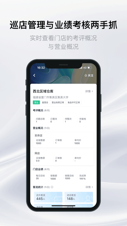 银豹巡店app支持包括现场检查、远程监控、视频连线在内的多种巡店场景,无论是日常巡检还是突发情况处理都能完美应对。其远程巡店功能尤其出色,管理者无需亲临现场即可通过高清视频流实时查看门店运营状态,第一时间发现卫生、服务或陈列等问题。自检巡店功能则赋予门店自主管理能力,员工可按照预设流程完成日常检查,既减轻了管理压力,又显著降低了企业的人力成本投入。