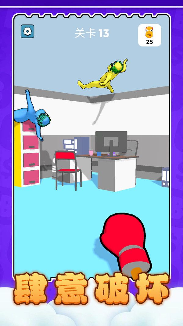 游戏以呆萌可爱的火柴人大叔作为主要破坏对象,这些角色形象鲜明有趣,夸张的表情和动作让人忍俊不禁。精心设计的多样化场景为玩家提供了丰富的解压环境,从室内到户外,从现代都市到奇幻世界,每个场景都带来全新的破坏体验。游戏最大的特色在于完全自由的破坏方式,你可以选择用巨型锤子砸扁火柴人,用火箭筒将其炸飞,或者用各种创意道具进行"折磨",完全按照自己的喜好来发泄情绪。