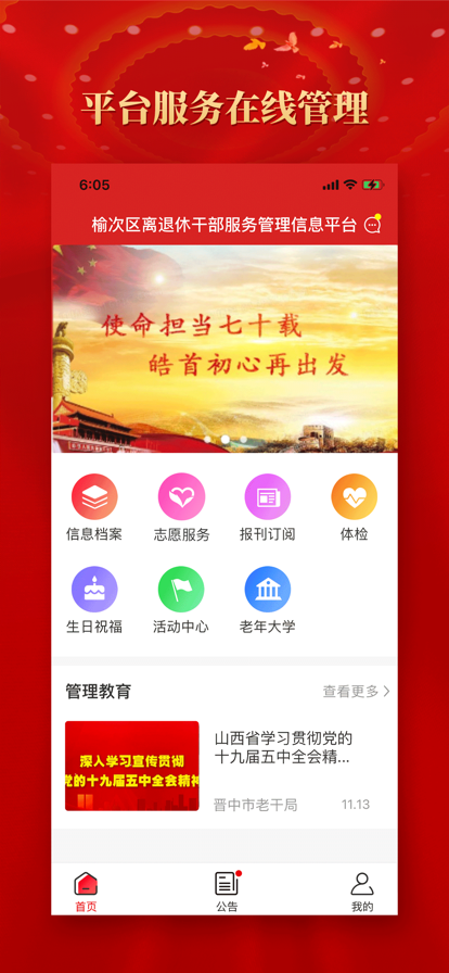 专为离退休老干部打造的一款移动应用端,充分考虑老年用户的使用习惯和需求;