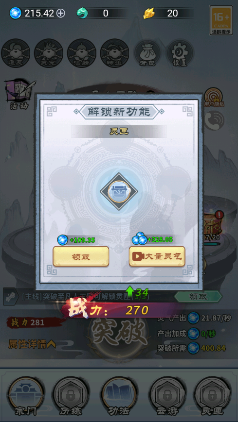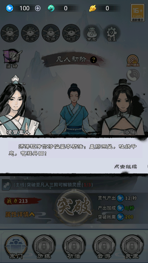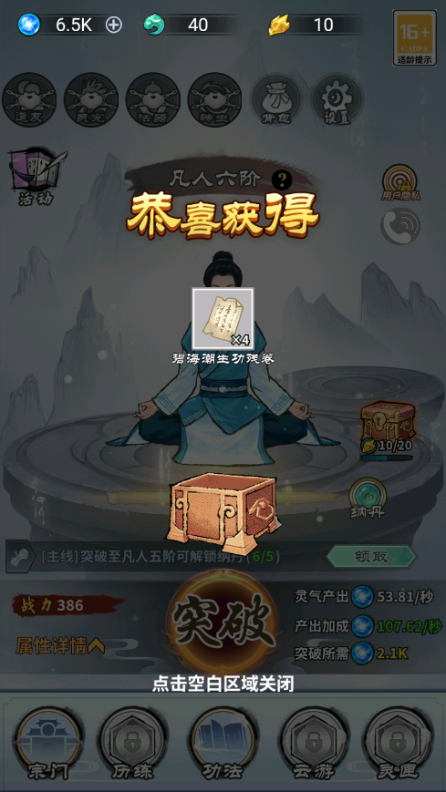 在这里你需要不断的去纳灵来提升修为,玩起来还是比较简单的。通过吸收天地灵气、服用丹药等方式可以加速修为增长,同时还要注意心境的提升。