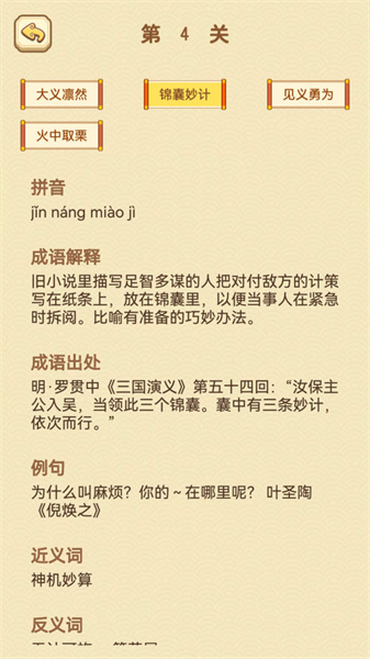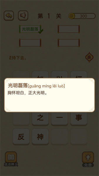 游戏拥有海量精心设计的关卡题库,玩家可以不断挑战新的成语内容。在闯关过程中,不仅能学习到丰富的成语知识,还能锻炼思维能力和反应速度。游戏画面精致细腻,每个关卡都配有独特的主题背景,让玩家在享受游戏乐趣的同时,也能获得视觉上的享受。