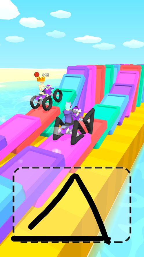 游戏开始后,玩家可以直接在屏幕上绘制自己想要的轮胎形状。系统会立即将涂鸦骑士的轮胎变成你所绘制的形状。不同的轮胎形状会带来完全不同的行驶特性,玩家需要根据当前赛道环境选择合适的轮胎设计。成功到达终点即可获得胜利,而面对复杂多变的赛道,灵活调整轮胎设计是制胜关键。