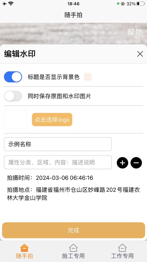 工到相机内置了丰富多样的行业专属水印模板,涵盖时间、地点、经纬度、项目名称、施工阶段等关键信息,用户可以根据实际需求自由选择或自定义水印内容。软件支持文字和图形两种类型的水印,满足不同场景的多样化需求。此外,实时预览功能让用户可以随时调整水印的位置、大小和样式,确保最终效果符合预期,操作简单便捷。