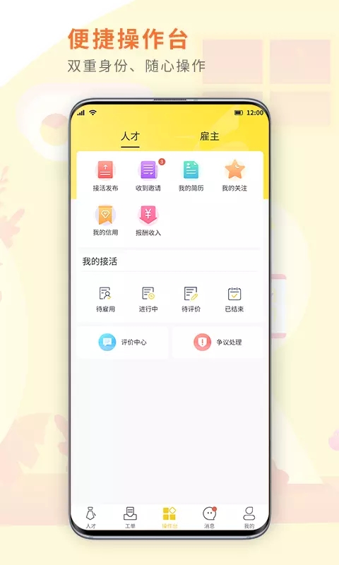 【双重身份】创新性地允许用户同时拥有求职者和雇主双重身份,用户可以根据自身需求随时切换角色,既可以在平台上寻找工作机会,也可以发布用工需求,实现资源的最优配置。