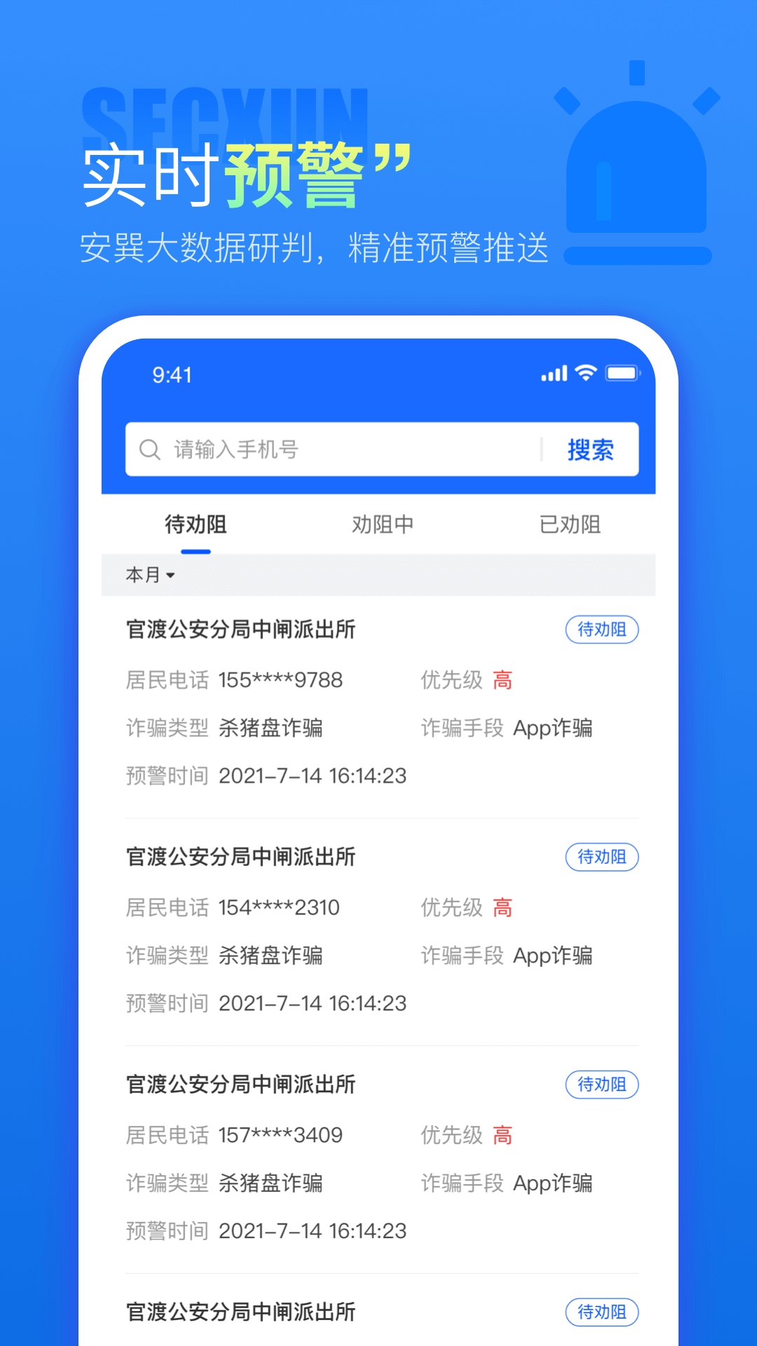 实时预警:安巽大数据研判,精准预警推送,采用AI算法实时分析诈骗风险;