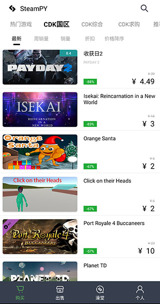 SteamPY手机版是一款专为移动设备用户量身定制的全新应用,完美适配手机操作习惯,为玩家打造了一个便捷高效的Steam游戏交易平台。该软件不仅提供海量优惠CDK购买渠道,还与手机版Steam客户端无缝衔接,让玩家享受更加流畅的使用体验。简洁直观的界面设计让操作设置变得轻而易举,同时支持账号绑定功能,确保交易过程安全无忧。所有交易均通过官方认证的聊天平台进行,有效防范诈骗行为,让您的每一笔交易都安心可靠。更令人惊喜的是,平台上的游戏价格普遍低于市场水平,让玩家能以超值价格入手心仪作品,享受前所未有的折扣福利。