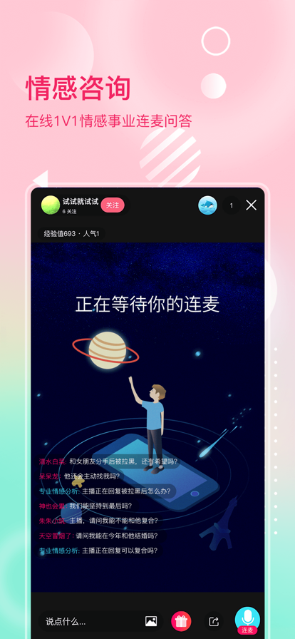 情感心理专场,你可以情感方面导师连麦咨询解决您的情感困惑,为你的爱情保驾护航。导师会运用心理学方法,帮助你理清情感问题本质,提供切实可行的改善建议。