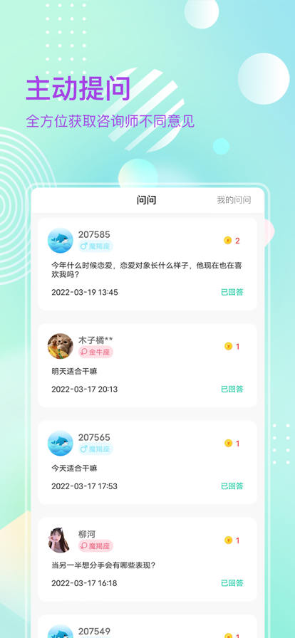 在去问你可以直接与星座达人和占星师还有心理及情感导师连麦聊天,享受即时互动的咨询服务体验。平台严格筛选认证导师团队,确保每位用户都能获得专业可靠的建议。