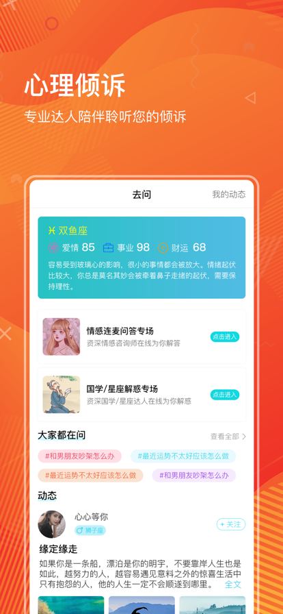 去问是一款专注于情感与星座领域的专业咨询平台,致力于为用户提供精准、个性化的心理支持与情感解答。在这里,你可以与经验丰富的占星师、塔罗牌解读师以及情感导师实时连麦交流,获取关于爱情、婚姻、友情等问题的深度解析。平台还提供星座匹配、每日运势预测、星盘分析等特色功能,结合周易、紫薇斗数等传统国学智慧,帮助用户全方位探索自我与情感世界。无论是寻求心理疏导还是星座奥秘,去问都能为你打开一扇通往心灵深处的窗口。