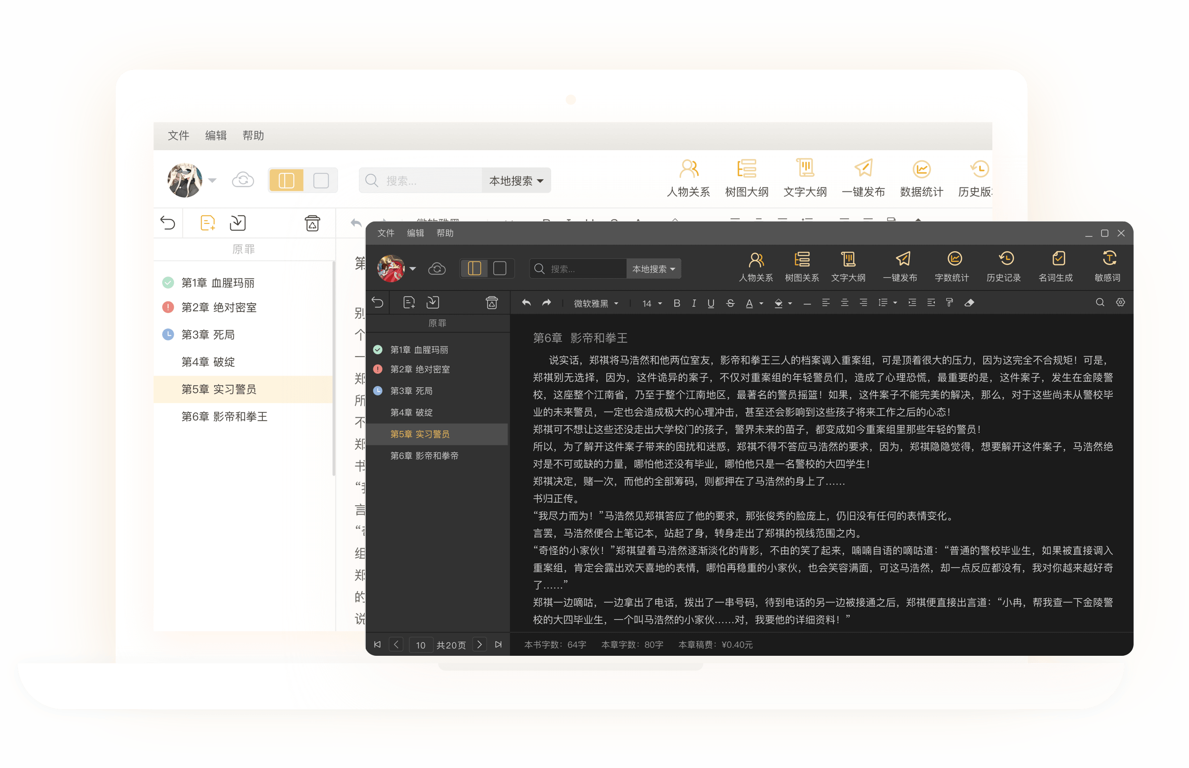 -快捷发布:无须复制粘贴,写完一键发布至阅文旗下站点。支持多种格式导出,满足不同平台的发布需求。