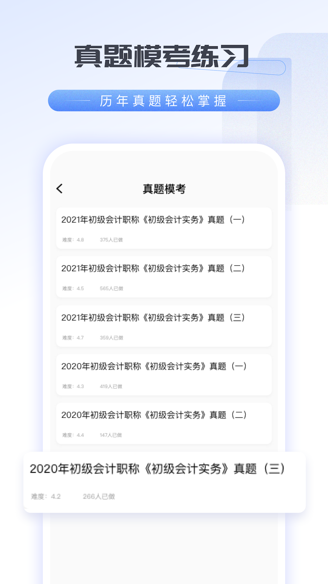 会计云学堂app可以有底气地对所有用户说:用了我,考证轻轻松松,简简单单。软件有真题模考、章节练习、考试练习等刷题模式,让用户全面掌握学习方法,查漏补缺,突破自己的弱项。平台采用智能算法分析用户学习数据,精准定位薄弱环节,推送针对性练习,大幅提升备考效率。