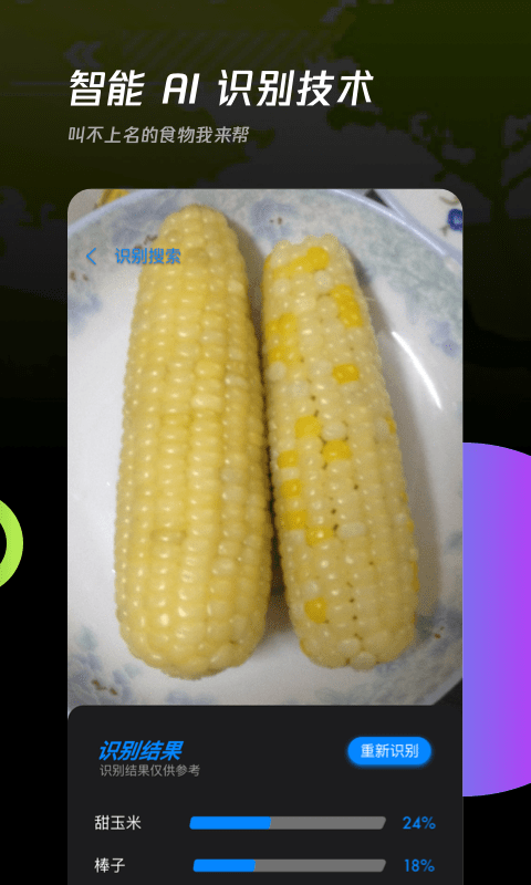 智能ai识别技术:叫不上名的食物我来帮,识别准确率高达95%,支持模糊查询。
