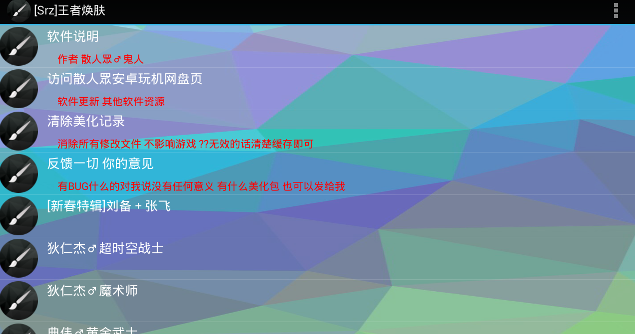 首先下载并安装[Srz]王者焕肤软件,确保设备兼容;运行软件后进入主界面,界面简洁明了,操作简单;在皮肤库中浏览并选择自己喜欢的皮肤,支持预览功能;点击确认即可完成皮肤修改,过程快速无延迟;若对修改效果不满意,可随时点击清除美化记录恢复原状;软件还提供皮肤收藏功能,方便玩家快速找到常用皮肤。