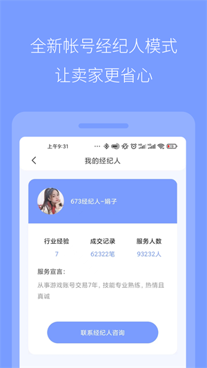 -带来全新的账号经纪人模式,帮助每一个用户完成游戏账号的交易,卖家放心出售,买家放心入手,专业经纪人提供全程交易指导;
