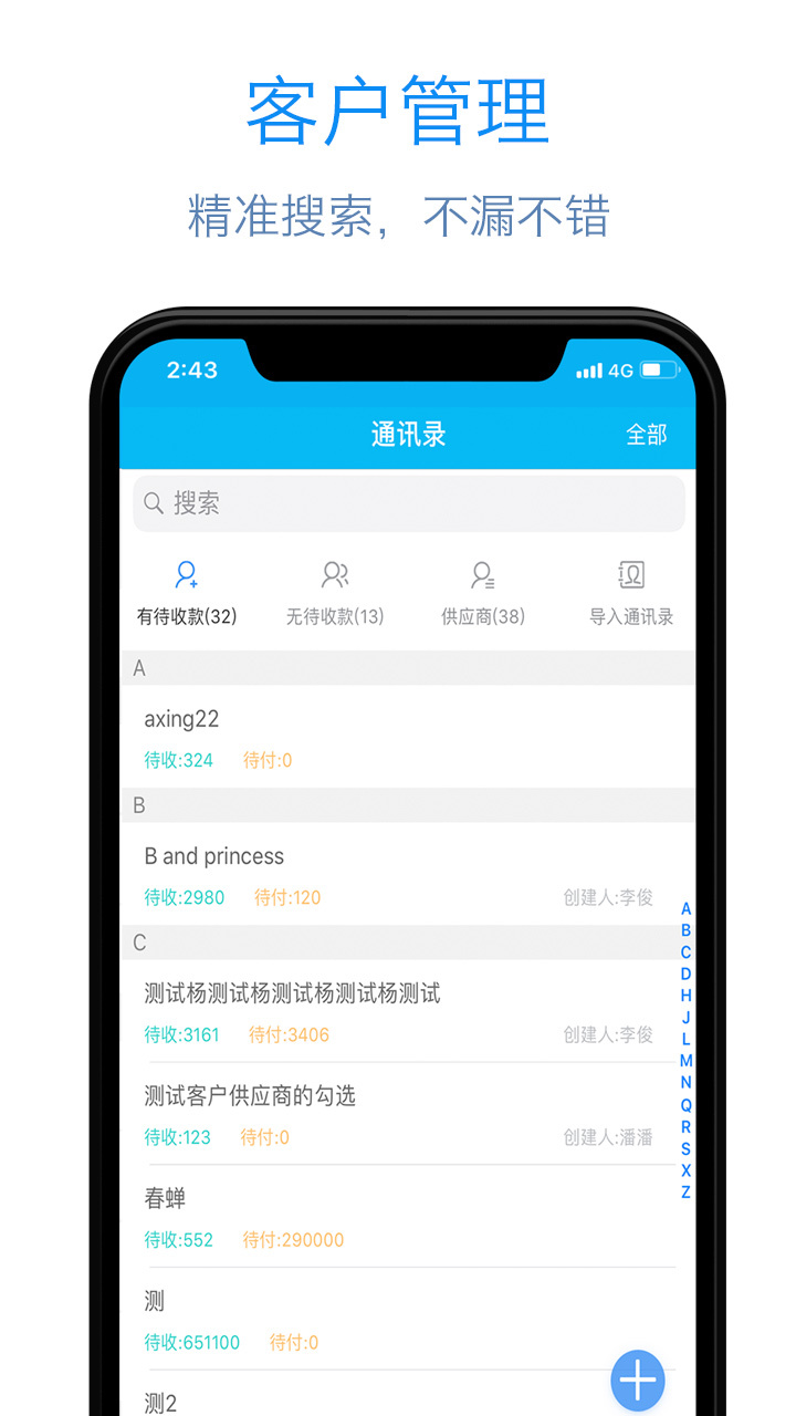 通过通讯录功能用户可以快速的查看到当前记录的需要收款的所有客户信息。系统会自动关联相关合同记录,让用户全面了解每个客户的交易情况。