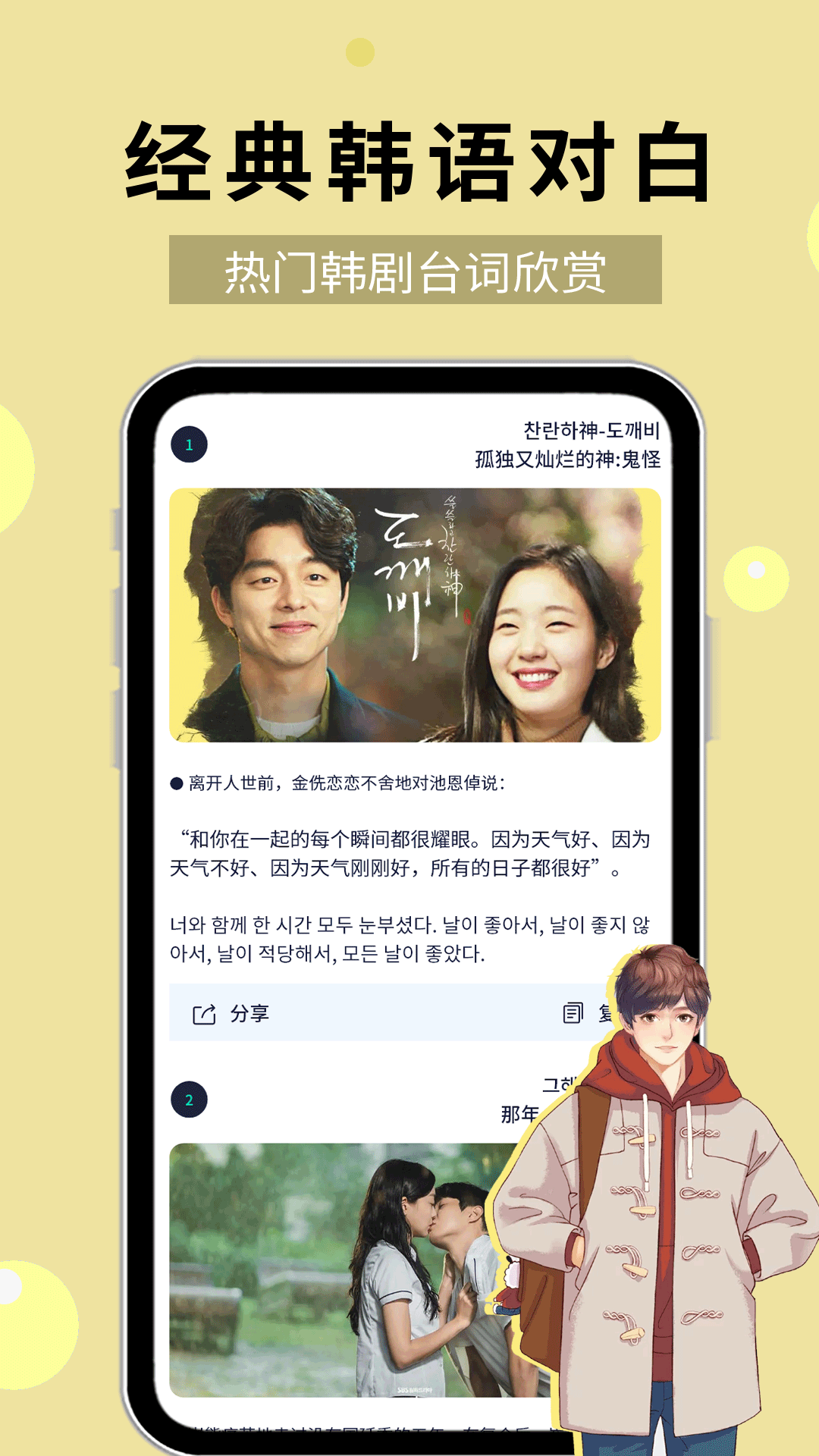 情景故事功能:你可以通过观看和配音韩剧中的视频片段,学习和模仿韩语的口气和表达方式。这些精选片段涵盖各种生活场景,用户不仅可以学习地道表达,还能了解韩国人的肢体语言和社交礼仪,让语言学习更加立体全面。