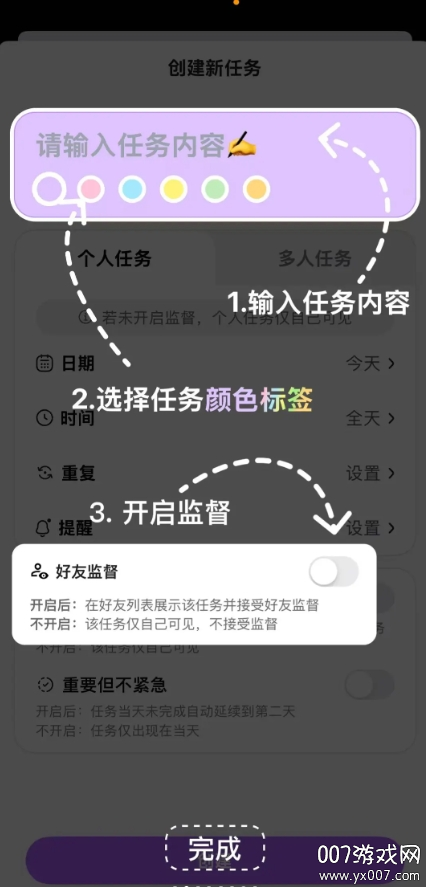 打开软件后,首先可以创建新任务,为每个任务设置专属名称和详细描述。接着在标题栏添加个性化留言,记录任务要点或激励话语。软件提供丰富的颜色选项,用户可以为不同类别的任务选择不同颜色,实现视觉化分类管理。在好友功能中,点击好友头像即可选择任务参与者,建立协作关系。完成任务后,系统会自动提醒好友进行每日打卡,保持互动监督。此外,用户还能随时添加新好友,扩大社交监督圈,让习惯养成更有动力。